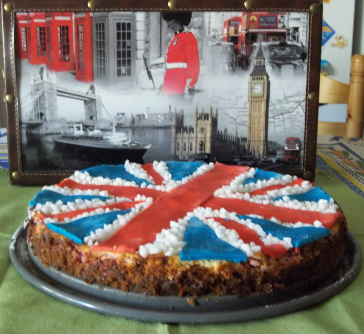 Pour la décoration du drapeau du Royaume-Uni, l’Union Jack, j’ai utilisé de la pâte à sucre bleu et rouge et des perles de sucre mais vous pouvez également utiliser des fruits comme la mûre et la framboise. Découpez quatre bandes de pâte à sucre rouge, dont deux qui seront un peu plus large pour former la croix de départ. Les deux autres bandes rouges plus minces seront disposées en diagonales. Ensuite, découpez cette fois huit morceaux de pâte à sucre bleu en forme de triangles allongés d’une taille à peu près égale chacun. Placez-les entre les bandes rouges. Enfin, remplissez les espaces vides entre les bandeaux de pâte à sucre rouge et bleu avec des perles de sucre. Voilà un beau drapeau “Union Jack”, le tour est joué !
