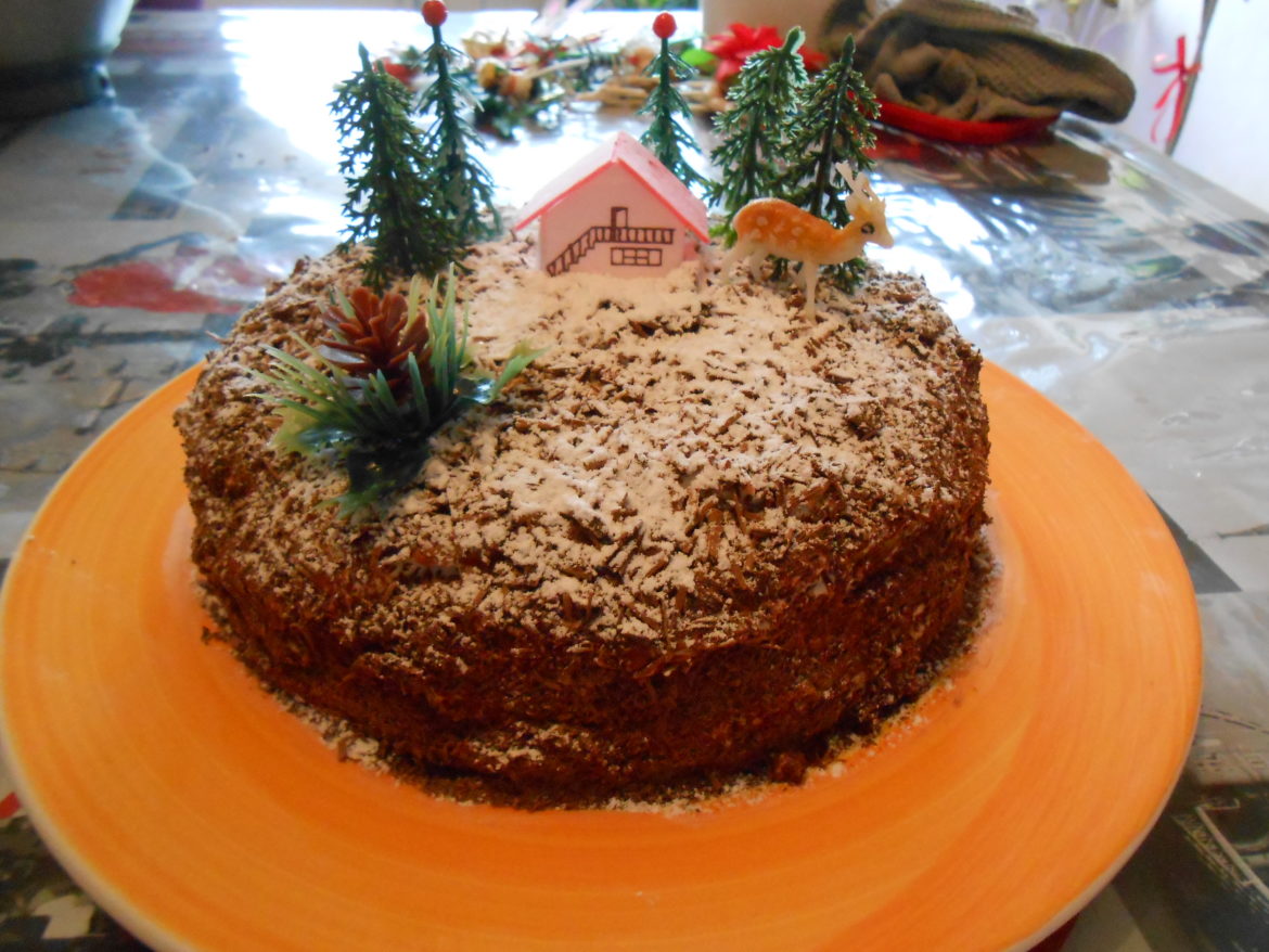 9. Recouvrir entièrement votre forêt noire de copeaux de chocolat et saupoudrer d’un peu de sucre glace pour représenter la neige. Décorer votre gâteau à votre guise avec des sapins, faon sans oublier une petite maison !